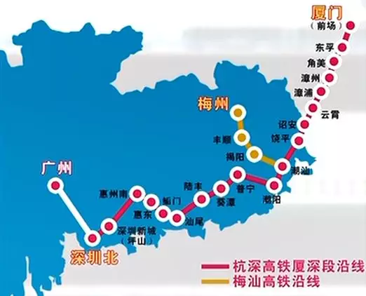 梅汕高铁沿线设梅州西、畲江北、建桥、丰顺东、揭阳、揭阳机场、潮汕7个车站,梅州至广州、深圳最快仅需3小时25分和2小时52分。