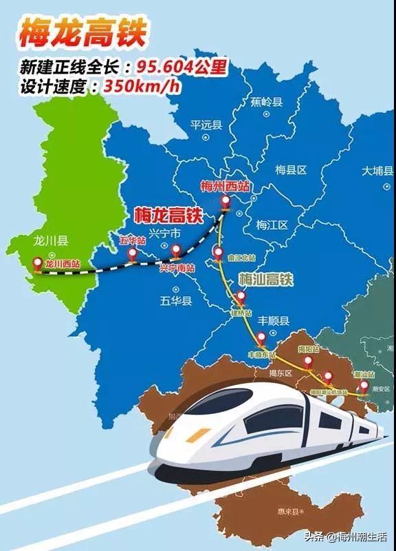 2019年12月15日,梅龙高铁正式开工,梅龙高铁是双龙铁路的一部分,设计时速为350公里,新设兴宁、五华两个站。梅龙高铁开通后,梅州到广州1.5小时,到深圳75分钟,将成为粤东地区通往江西方向的便捷高铁通道,对于促进沿线老区苏区振兴发展和全省区域协调发展具有重要的意义。