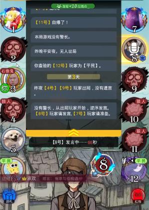 胡乱投票之后,不但让好人逐一被抗推出局,也让石像鬼有了下刀的机会,最终石像鬼逐一查验身份后,抓住机会杀光了平民,屠边获胜!