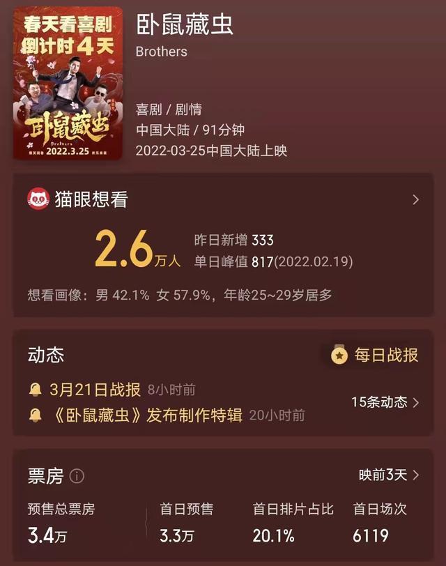 现在距离《卧鼠藏虫》的上映,只剩下几天的时间,目前该片已经开启了票房预售。因为并不是很令人期待,所以它的预售票房成绩并不是很可观,据电影平台显示只有3.4万人民币。