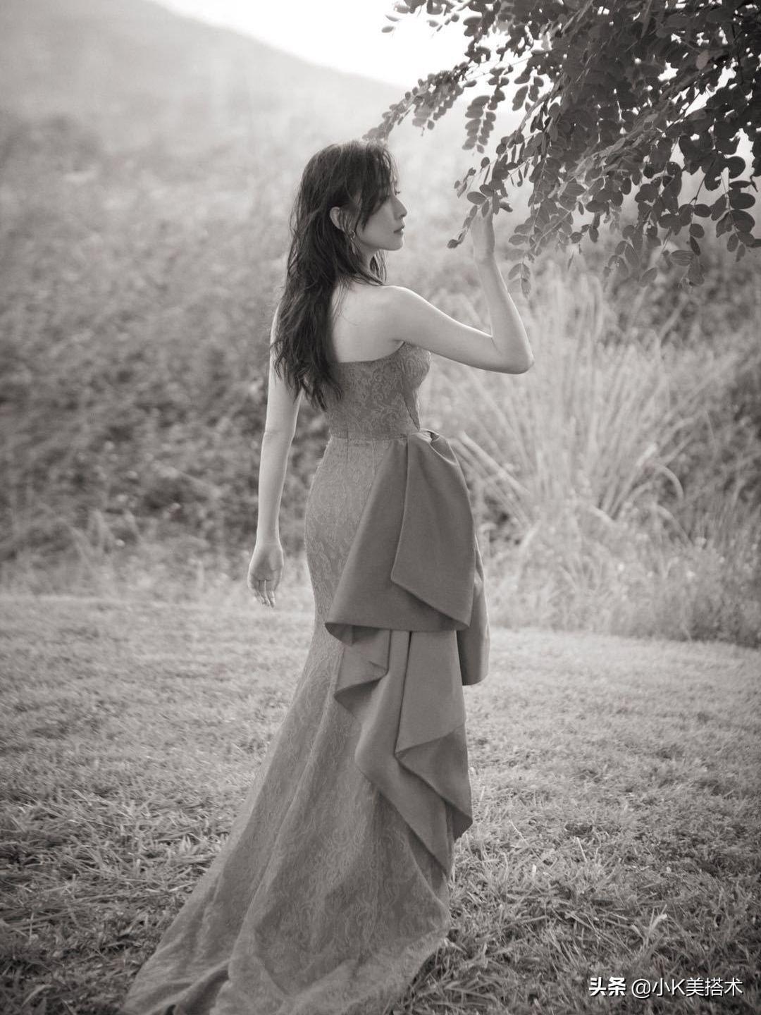 不得不说,胡静的身材保持得实在是太好了!这一件抹胸长裙同样也是十分修身的设计,不过搭配了褶皱式的剪裁,看上去比较考验身材,不过胡静依旧驾驭得非常好。抹胸搭配湿发,性感的锁骨和立体的肩部线条若隐若现,更加性感迷人了!