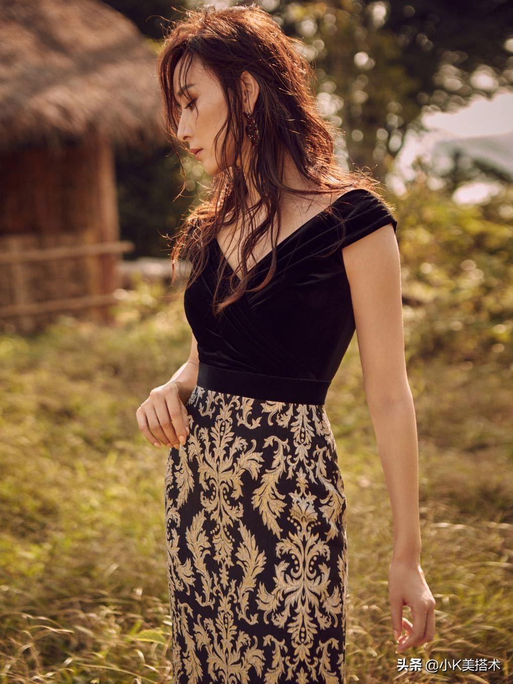 胡静这一套造型看上去给人一种职场干练女强人的感觉。黑色深V露肩上衣和印花裙摆的拼接,看上去性感又不失优雅!同样是十分修身的造型,这一套搭配看上去比较日常化,也是可以搭配出街的造型,看上去性感又带着点休闲。