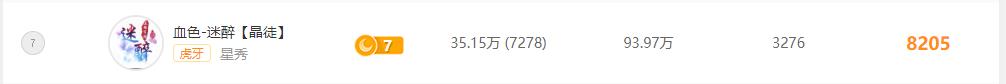 迷醉,外显93万,贵宾3276,日活8205。30%自己粉丝,10%过路粉丝,40%超跑粉丝。20%宝图粉。(新闻主播中算是比较高的)