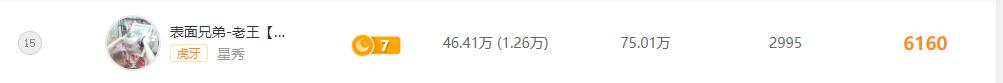 老王外显75万,贵宾2995,日活6160。85%自己人,15其他粉丝。
