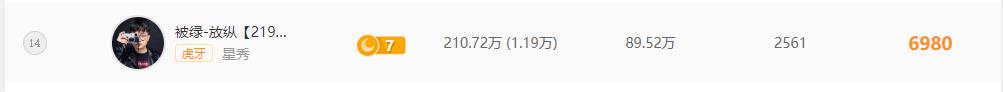放纵,外显89万,贵宾2561,日活6980人,85%自己人,15其他粉丝。