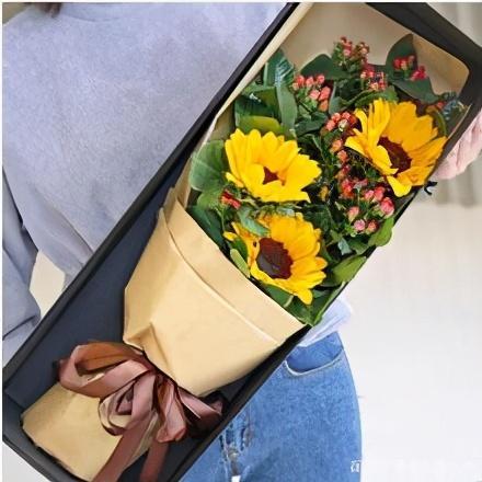 花材:1枝向日葵,1枝金色海岸玫瑰,2枝香槟玫瑰