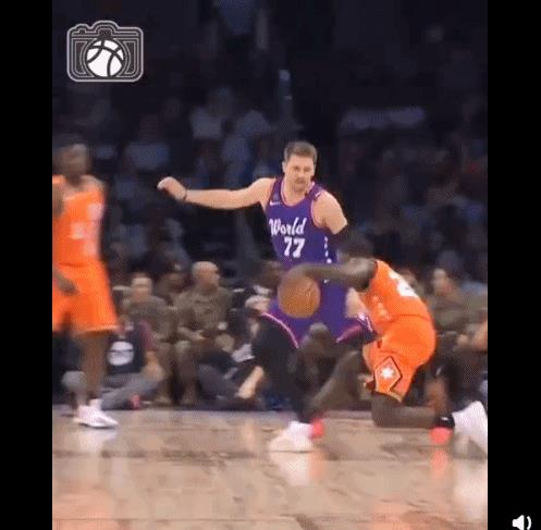 也就是大家所熟悉的胯下急停拉回,往前炸球同时伸出其中一脚,幅度大一点,甩开防守人一瞬间,停住将球胯下拉回,收脚合球投篮,一气呵成!秀翻全场!