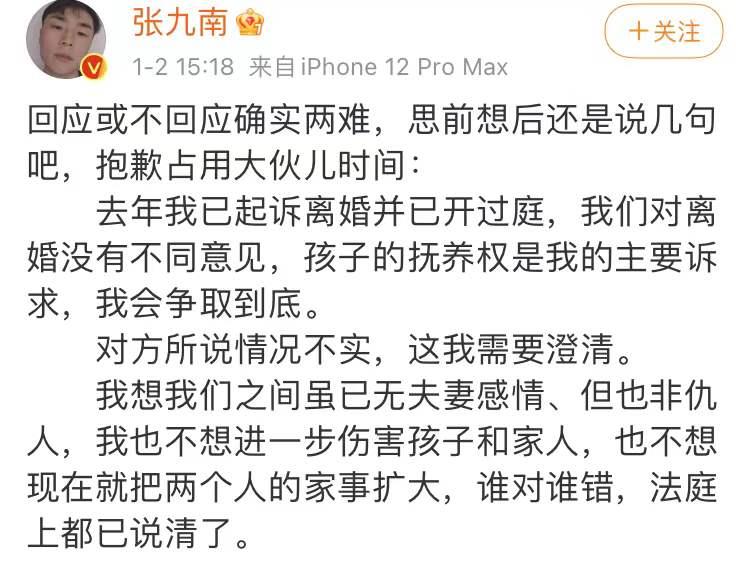 去年12月2日王九龙当街小便,未洗手吃零食。1日迎来了何九华和王鸥疑似绯闻曝光,2日张九南又惊现热搜首位,前妻的一条微博让他挂上了热搜,指控他出轨,并要求他共同承担二人孩子的教育经费及房贷。