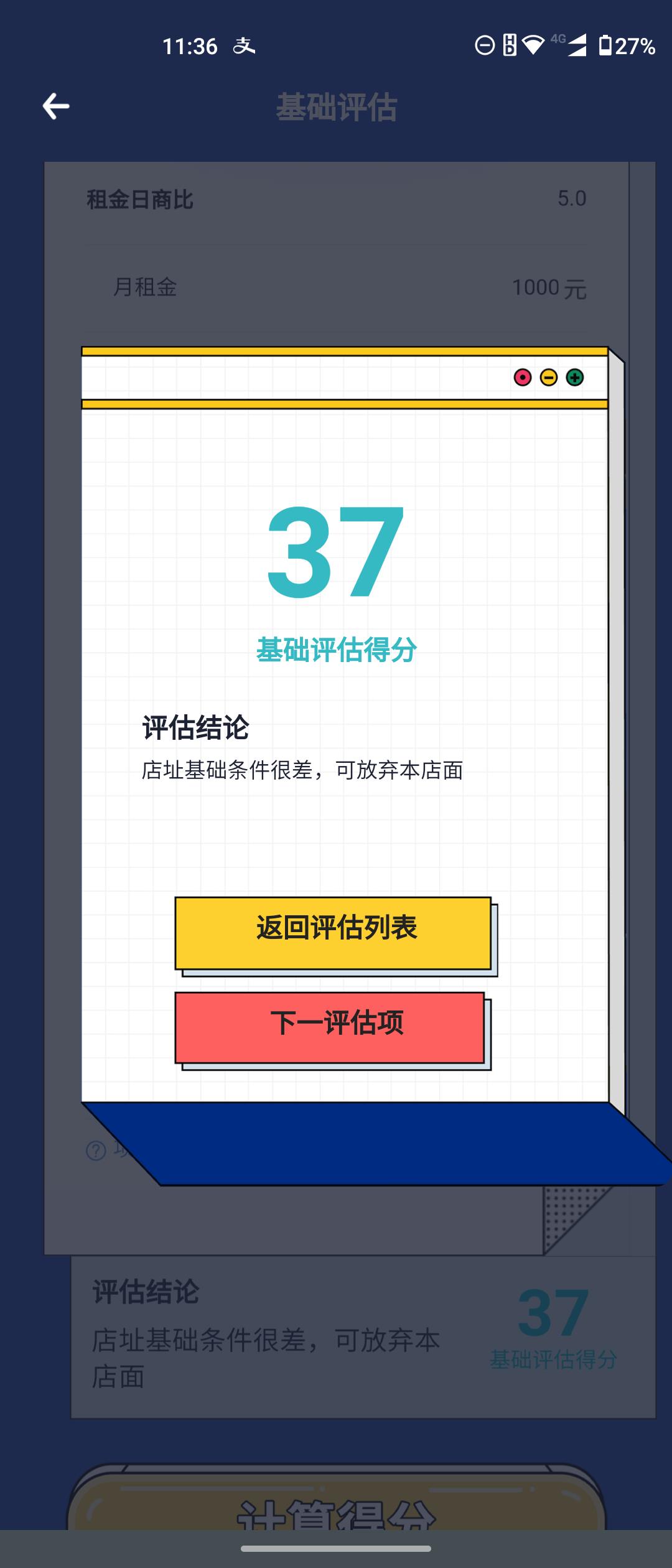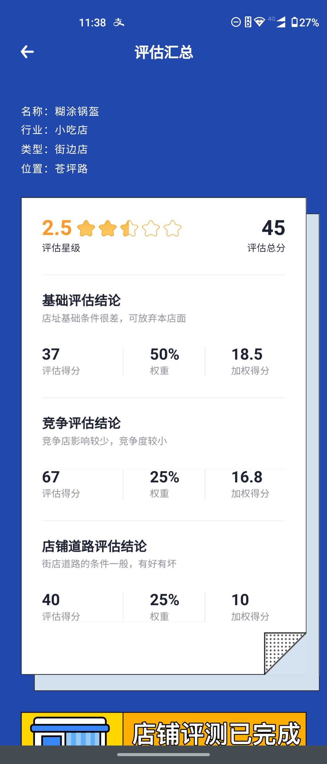 铺面的基础得了37分,直接叫我放弃店面,接下来综合了店铺周围竞争和店铺周围道路的评估,满分5分,得了2.5