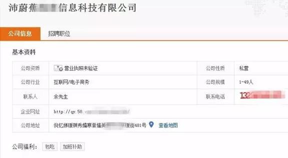 点击第一条招聘信息,页面上显示,这条信息已经有460次浏览。这家公司的营业执照未认证,名称为“沛蔚蕉XX信息科技有限公司”,地址也让人摸不着头脑。