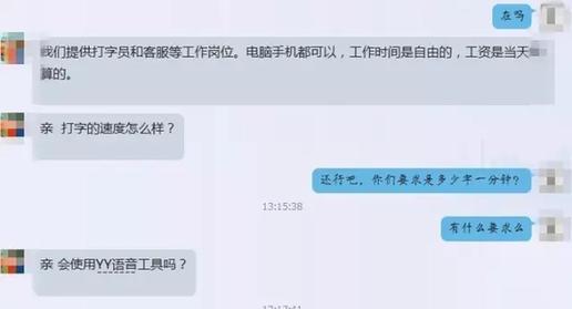 几经辗转,记者最终被拉进了一个语音聊天室,名为“桔子”的客服通过语音向刚刚进来的几位介绍业务流程。其中一个职位是“打字专员”。记者计算了一下,如果每分钟可以打60字,只要工作不到3个小时就可以赚到最低标准150元。