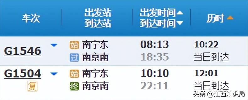 目前,南宁至南京每天有2个车次高铁,其中,G1504次列车耗时比G1546次列车耗时要长,用时为12小时1分钟。