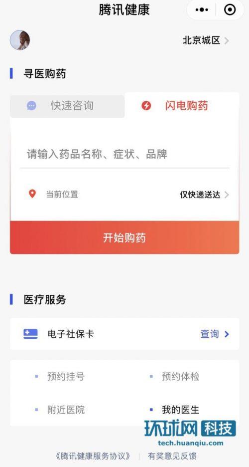 环球网科技记者从腾讯健康小程序中注意到,目前该项小程序的全部业务仅在深圳开通,在北京仅仅开放了闪电购药的服务。