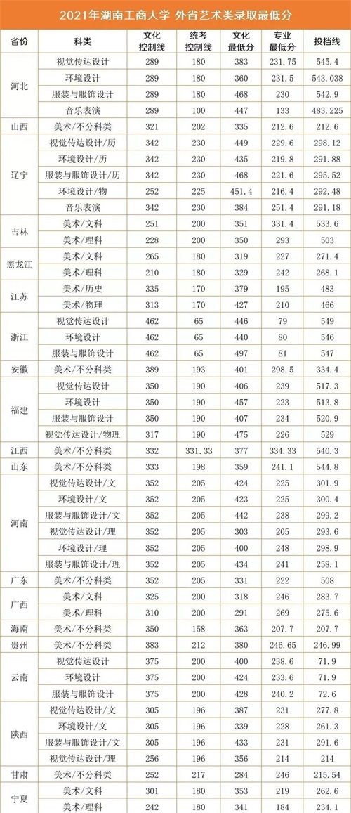 2021年湖南工商大学外省艺术类录取最低分