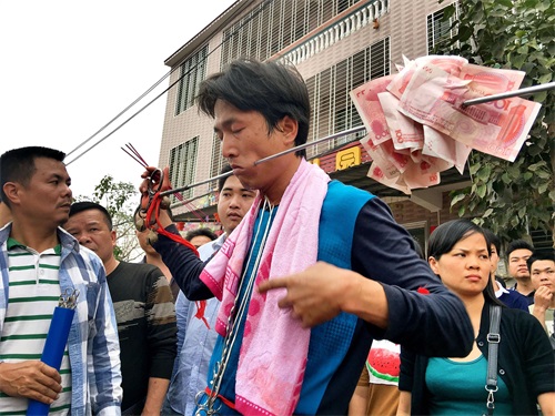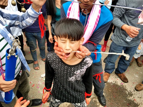 昨日参加南丰镇公期,海南琼北农村基本上村村都过公期,有的地方叫军坡节,但是穿杖并不是没个村都有的,穿杖是在海南民俗活动中一种形式, 穿杖者用拇指粗的钢筋或银釺将自己的腮穿通,还有人会刺穿喉咙皮部位 ,多者几十人穿在一根釺上 了,你现场见过吗?