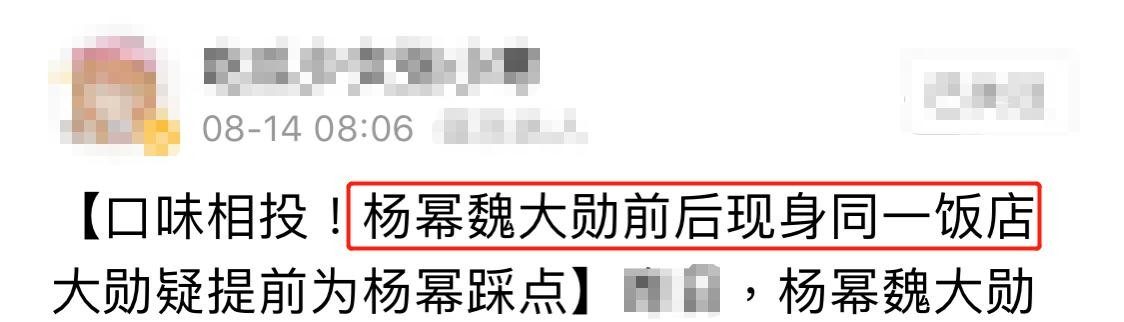 8月14日,有媒体曝光了一组杨幂和魏大勋一前一后现身横店同一家餐馆的画面。