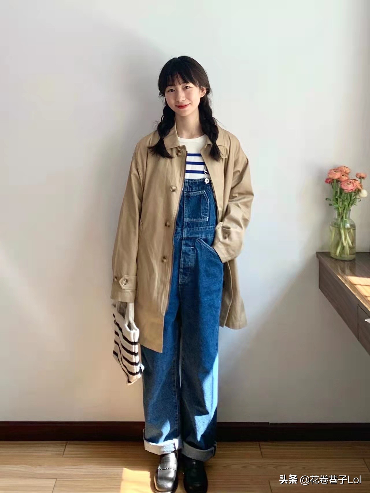 背带裤搭配一件风衣外套,很日系,也很飒。这个穿搭非常适合小个子,风衣版型也超级爱