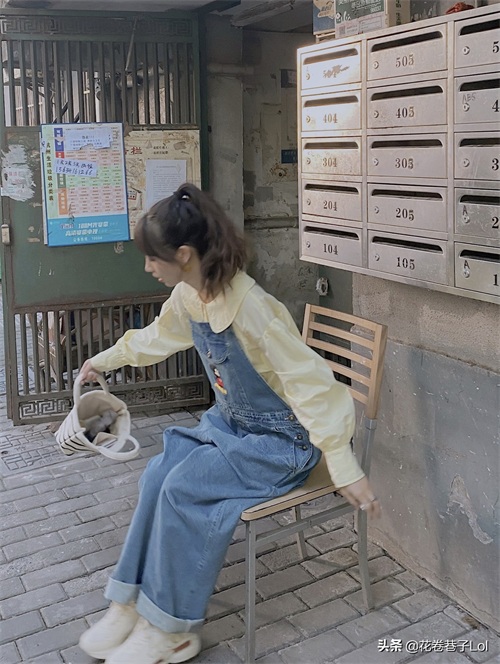 “娃娃领衬衫+牛仔背带裤”,这款oversize版的古着感背带裤不管是颜色、版型,还是刺绣都是经典耐看型的,搭配亮眼的黄色娃娃领衬衫整体少女青春活波,太可爱了