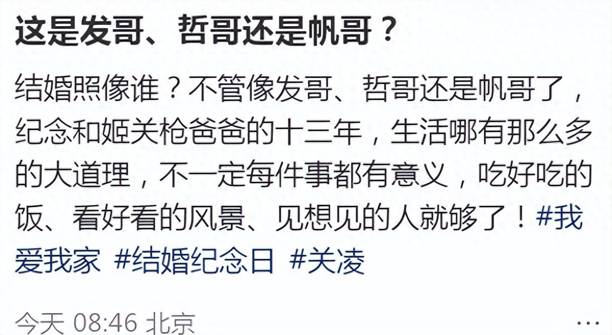 面对网友对夫妻俩状态的调侃,关凌本人也回应了。被网友夸赞的她表示还是很开心的,笑称:“结婚生子的苦也不能我一个人吃”。