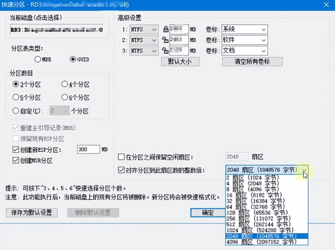 启动DiskGenius软件→选择硬盘→快速分区,在对齐设置中,选择“对齐到分区整倍数”选项。对于小于120GB的SSD,选择4扇区(2048字节);对于大于120GB的SSD,选择8扇区(4096字节)。