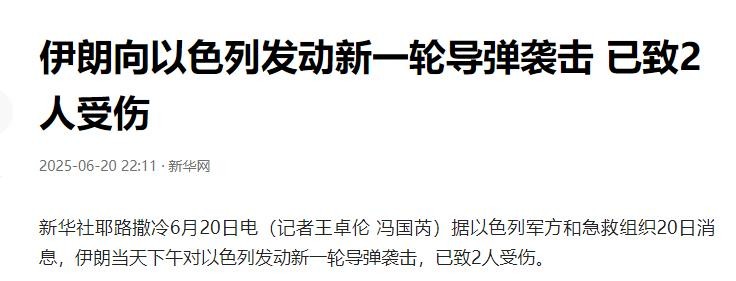 信息来源:“新华网”——(伊朗向以色列发动新一轮导弹袭击 已致2人受伤)