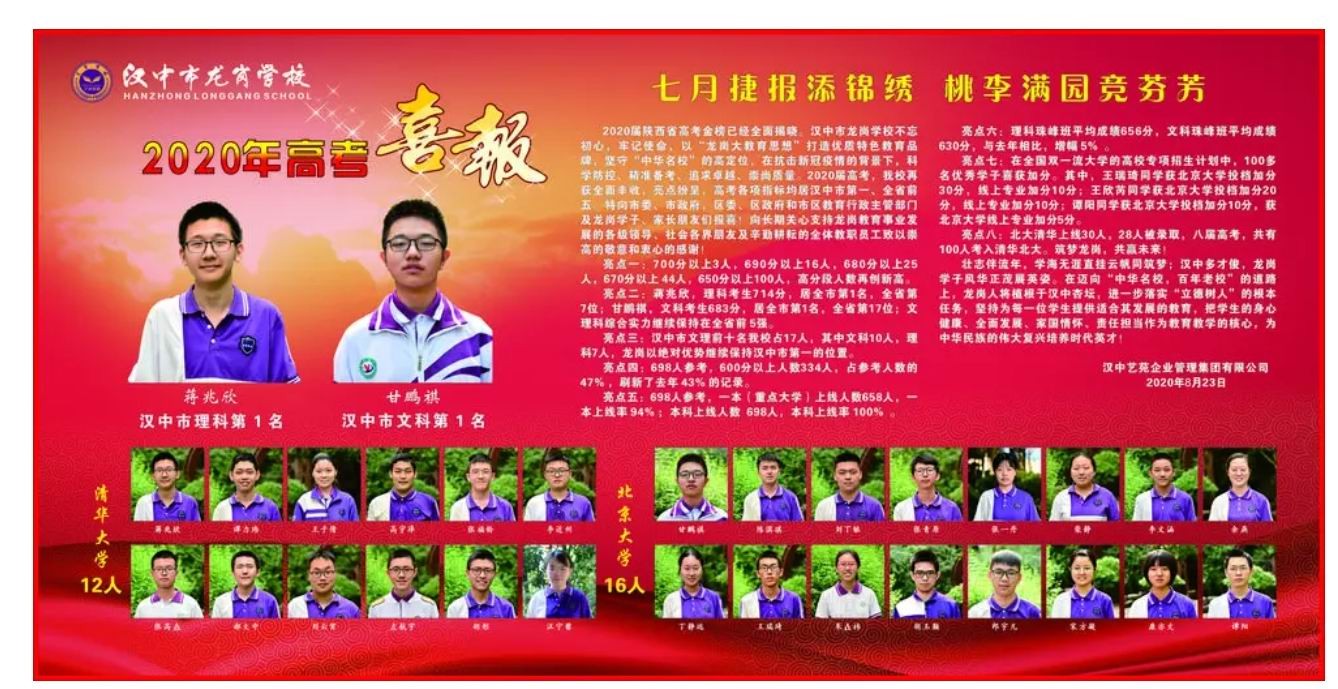 2023年高考成绩甫一发布,汉中龙岗中学的股东“汉中艺苑企业管理集团有限公司”即发布《贺信》,宣告汉中龙岗中学高考再传捷报: