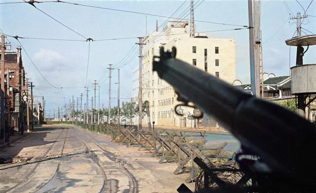△1937年的上海街头,日本的6名海军陆战队员,正在引导战列舰远程炮击。