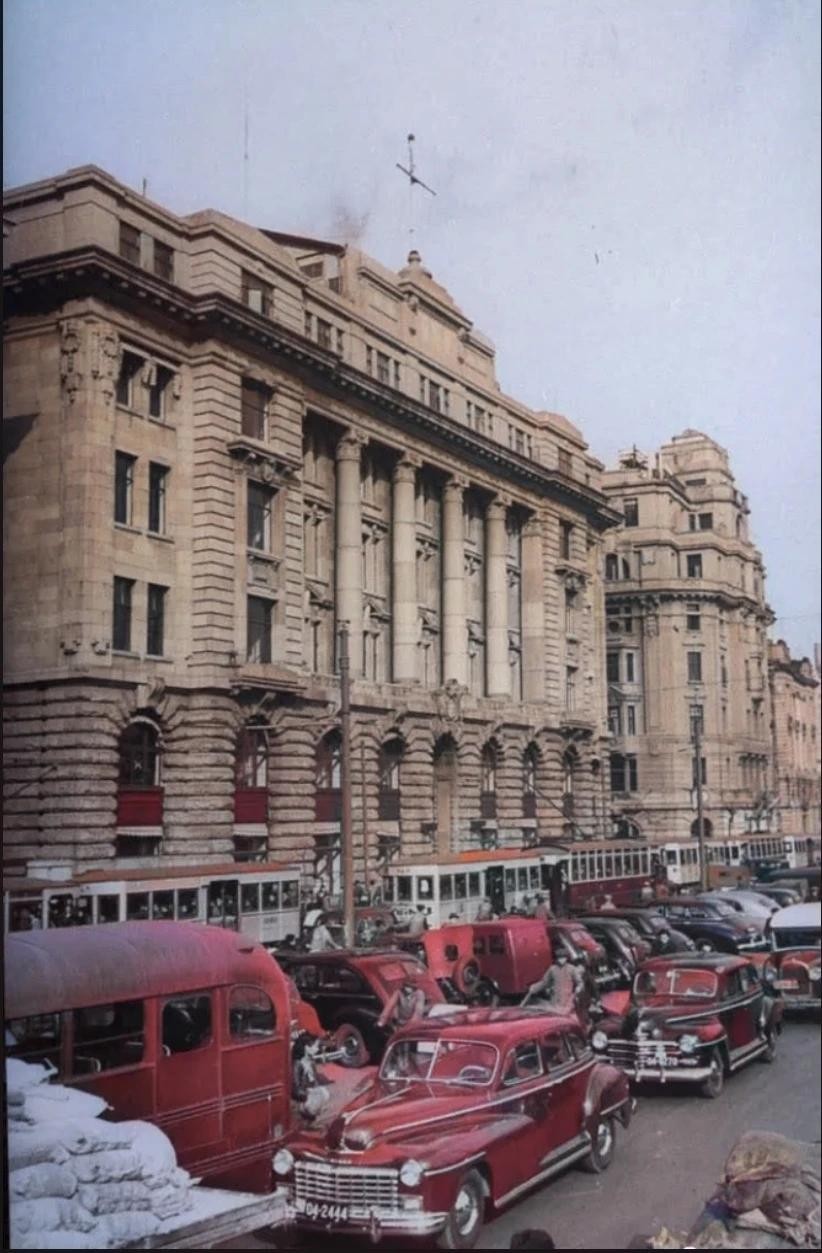 △1946年的上海街头,此时二战已经结束,上海滩再度热闹起来,宽阔的马路上,甚至堵起了车。
