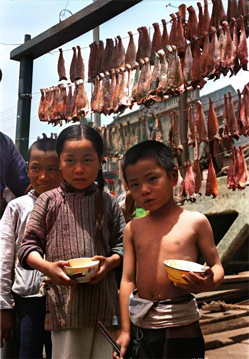 △1945年,黄浦江边渔民的孩子,背后挂满了鱼干,但三人衣着却很朴素。
