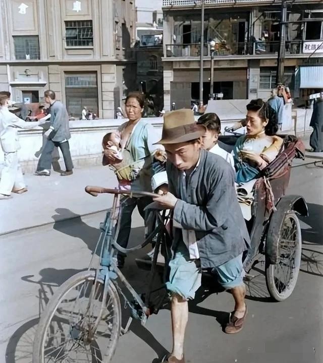 △1947年的上海街头,一名黄包车夫,艰难的推车前行。