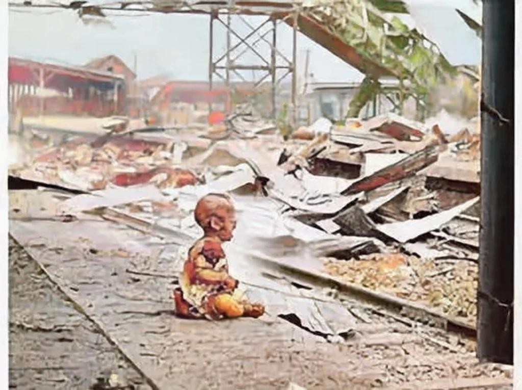 △对着废墟痛哭的儿童,他的房屋与亲人都消失了在日军炮火中。