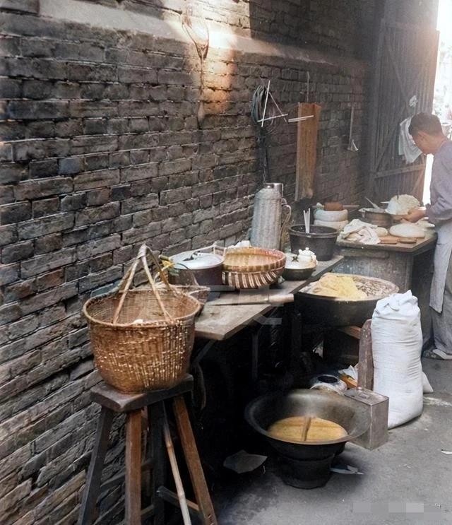 △弄堂里的早点摊,旁边居然放了一大袋面粉!