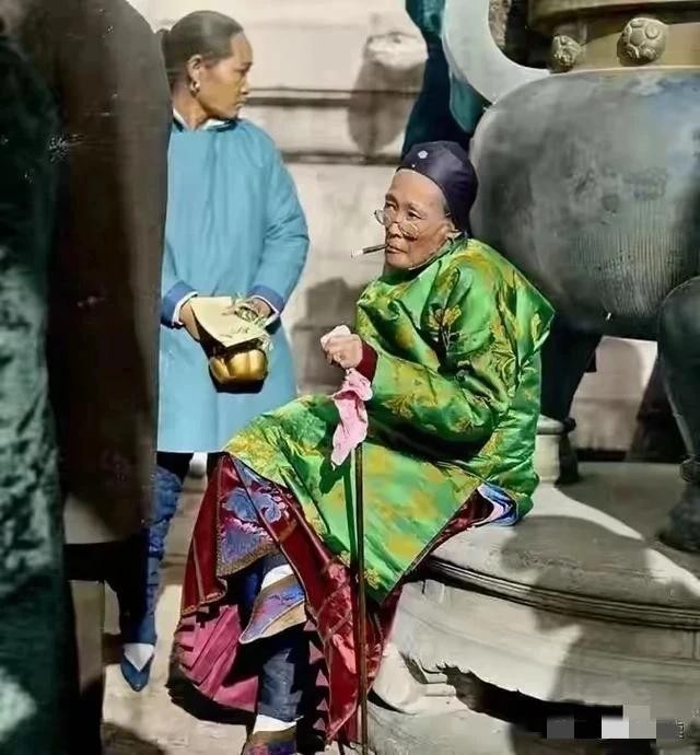 △1909年,在豫园门口休息的上海老太太,衣着华贵,气度不凡。