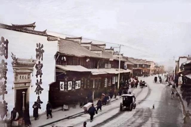 △1900年南京路,两侧的店铺,还都是古色古香的中式建筑,不过已经出现了电线杆和汽车。