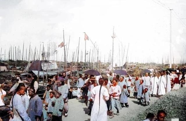 △1893年的上海外滩,虽然很热闹,但是还没有高楼大厦,一群清朝人在码头上走来走去。