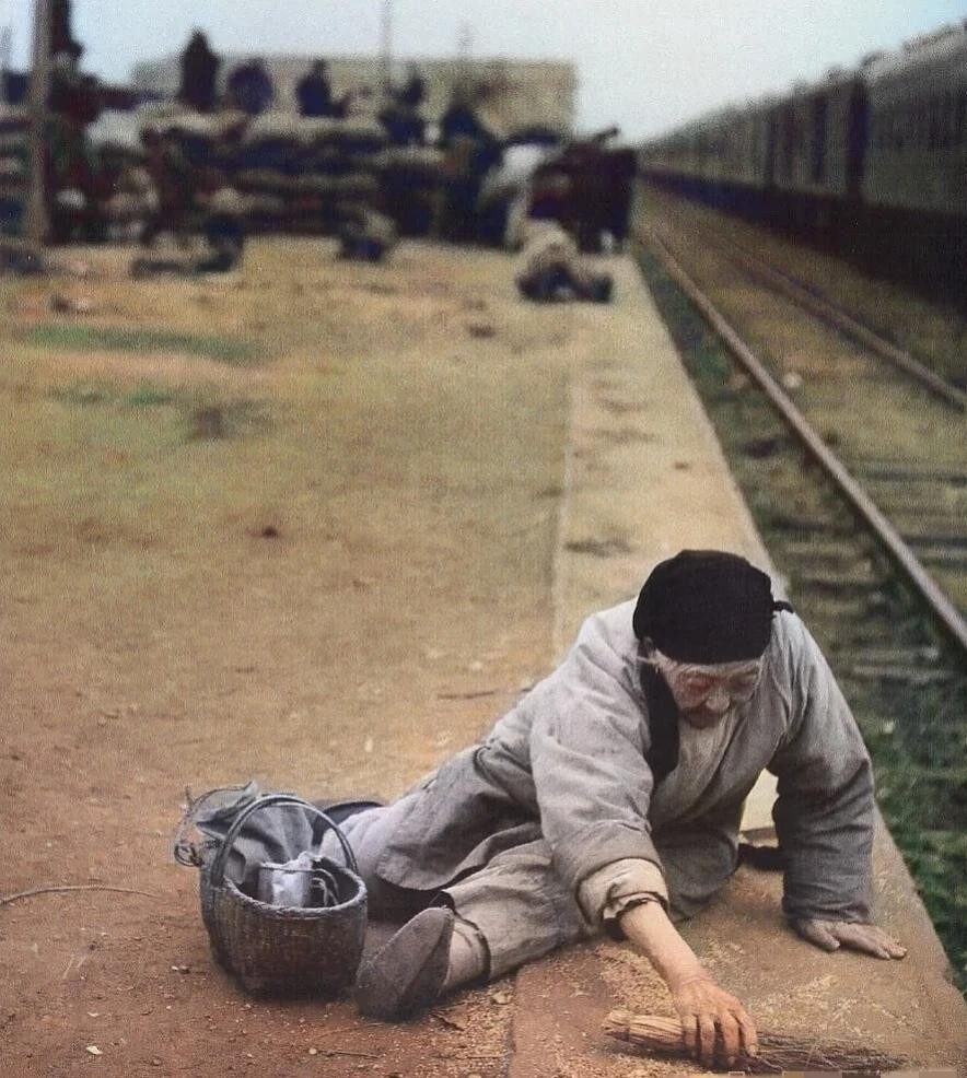 △1949年3月,上海车站的一位老太太,正小心翼翼搜集,地上掉落的大米。