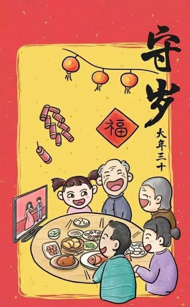 除夕守岁是最重要的年俗活动之一,守岁风俗由来已久,大家整夜不睡等待天明,称为“守岁”,除夕晚上,全家人团聚在一起,等吃过年夜饭,坐在火炉边聊天,熬夜通宵,象征把一切瘟疫病魔全部驱赶走,期待新的一年吉祥如意。