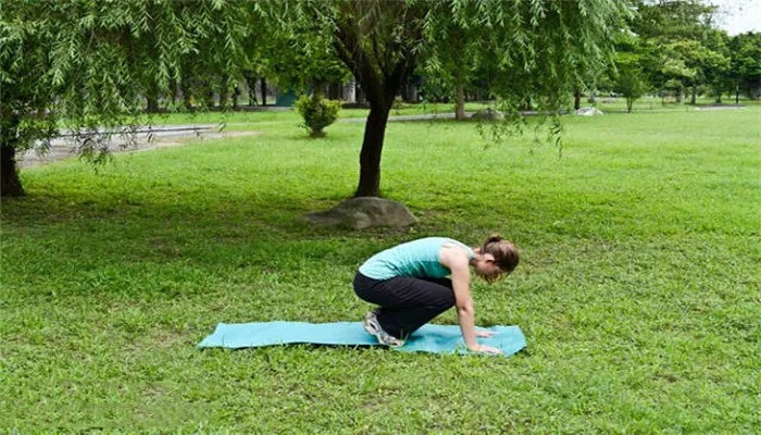 身体前倾,两侧手臂略微向前,双手手掌贴地。
