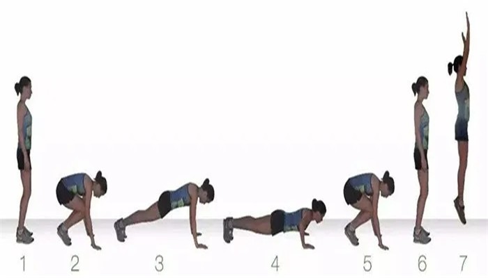 整个过程有7步操作,分别是站立、下蹲、后跳支撑、屈肘下压、上撑身体回位、前跳下蹲、向上跳跃。