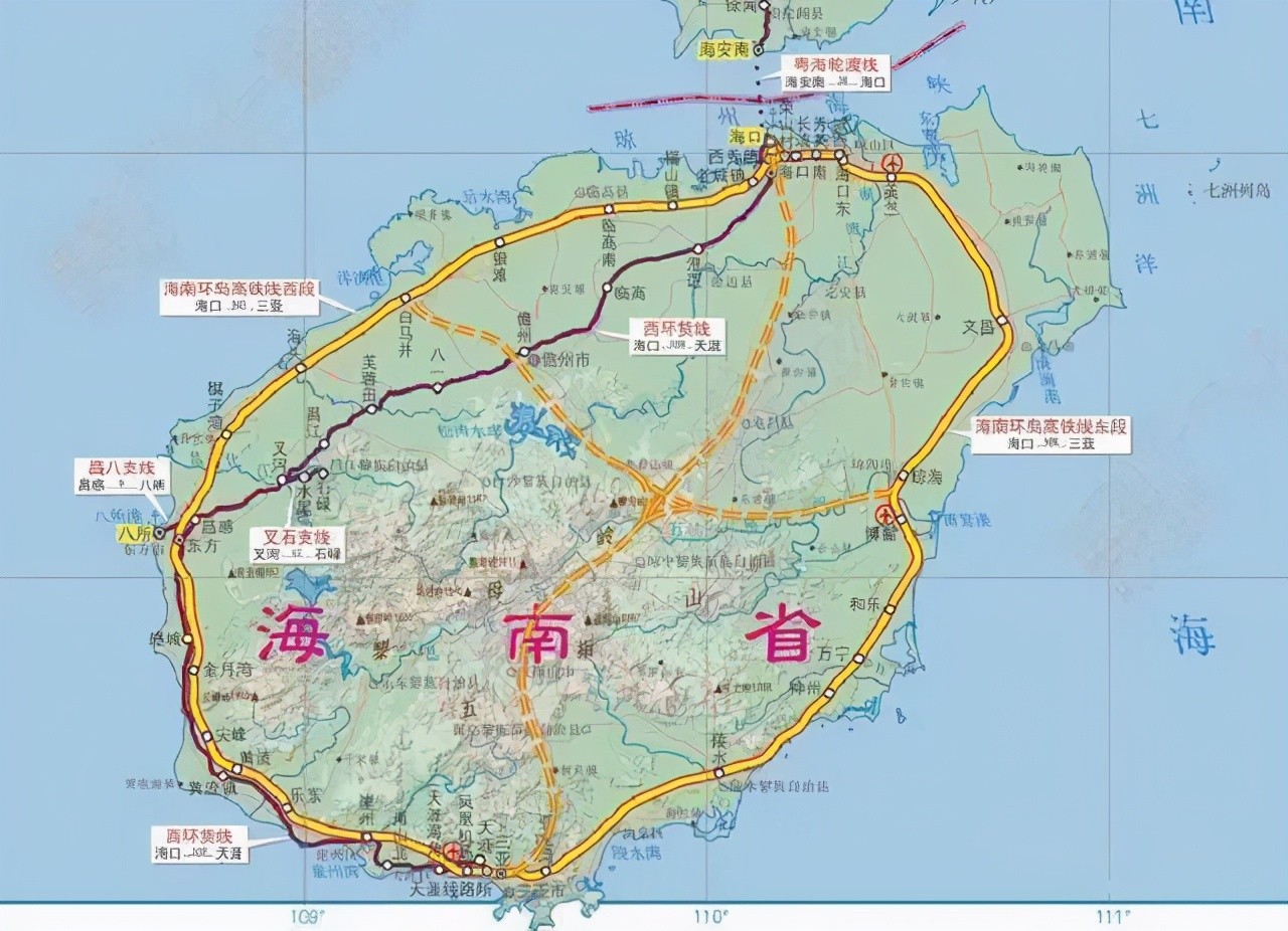 因地理限制,海南高铁还未连上大陆高铁网络。琼州海峡宽20多公里,海底隧道还在研究之中,但火车轮渡技术较为成熟,以后将考虑高铁列车轮渡过海,而湛海高铁就是设计采用轮渡过海。三沙市由各大小岛屿组成,四处环海,并不具备建设铁路的条件。