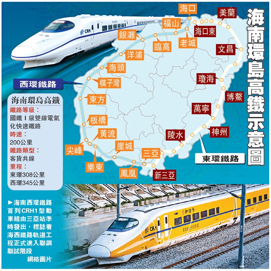 海南已开通运营一条环岛高铁,呈椭圆形状,把海南各县市串联起来。环岛高铁北起海口站、南至三亚站,环线全长653公里,共有25座客货车站,列车最高运营速度250公里/小时。海南环岛铁路分期分段建设,东环段于2007年9月29日动工建设,设计时速250公里,全长308千米,于2010年12月30日开通运营;西环段于2012年9月28日开工建设,全长345公里,设计时速200公里,于2015年12月30日开通运营,海南环岛铁路全线建成通车。