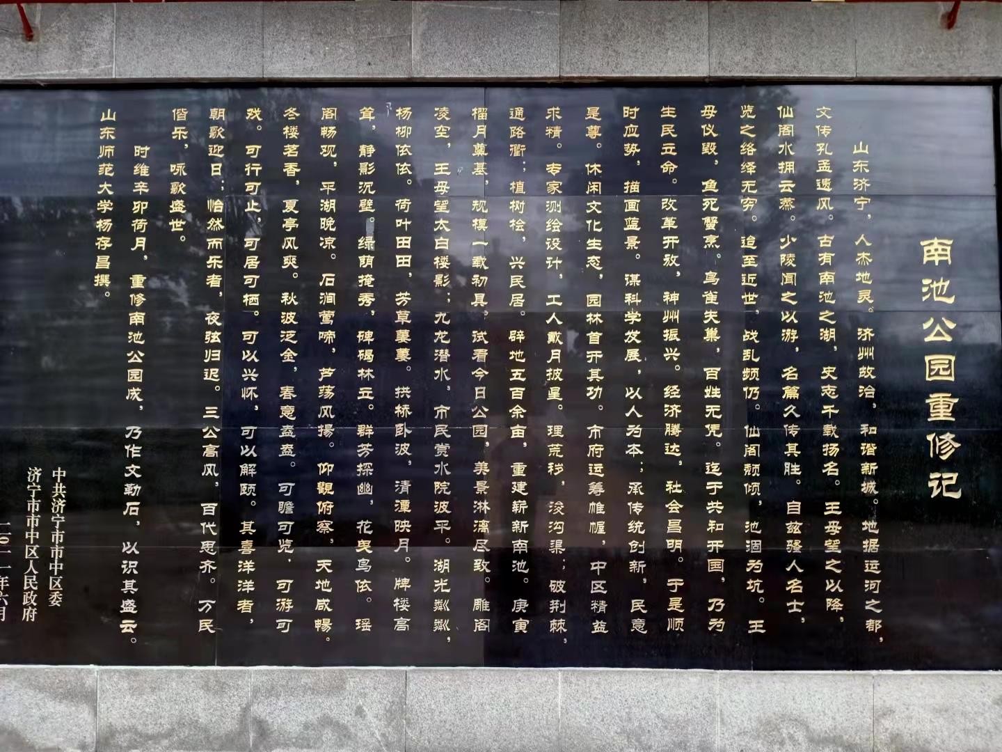 南池公园,位于山东省济宁市任城区龙行路。南池,原名“古南池”,由唐代南池王母阁重修并扩大而成。唐代诗人杜甫于开元二十五年探亲逗留济宁期间,游览南池,留下为后人啧啧称道的诗篇。康熙皇帝和乾龙皇帝南巡时,曾经为南池赋诗题字。古南池牌楼上的“古南池”三个字,即为乾龙皇帝手迹。重修之后的公园总面积达34.3公顷,其中水面11.9公顷。公园分为南北两大景区,北部为历史文化风景区,主要景点有王母阁、晚凉亭、诗碑、少陵祠等;南部为生态旅游风景区,路面为透水环保砂石构成,铺装颇具人性化。