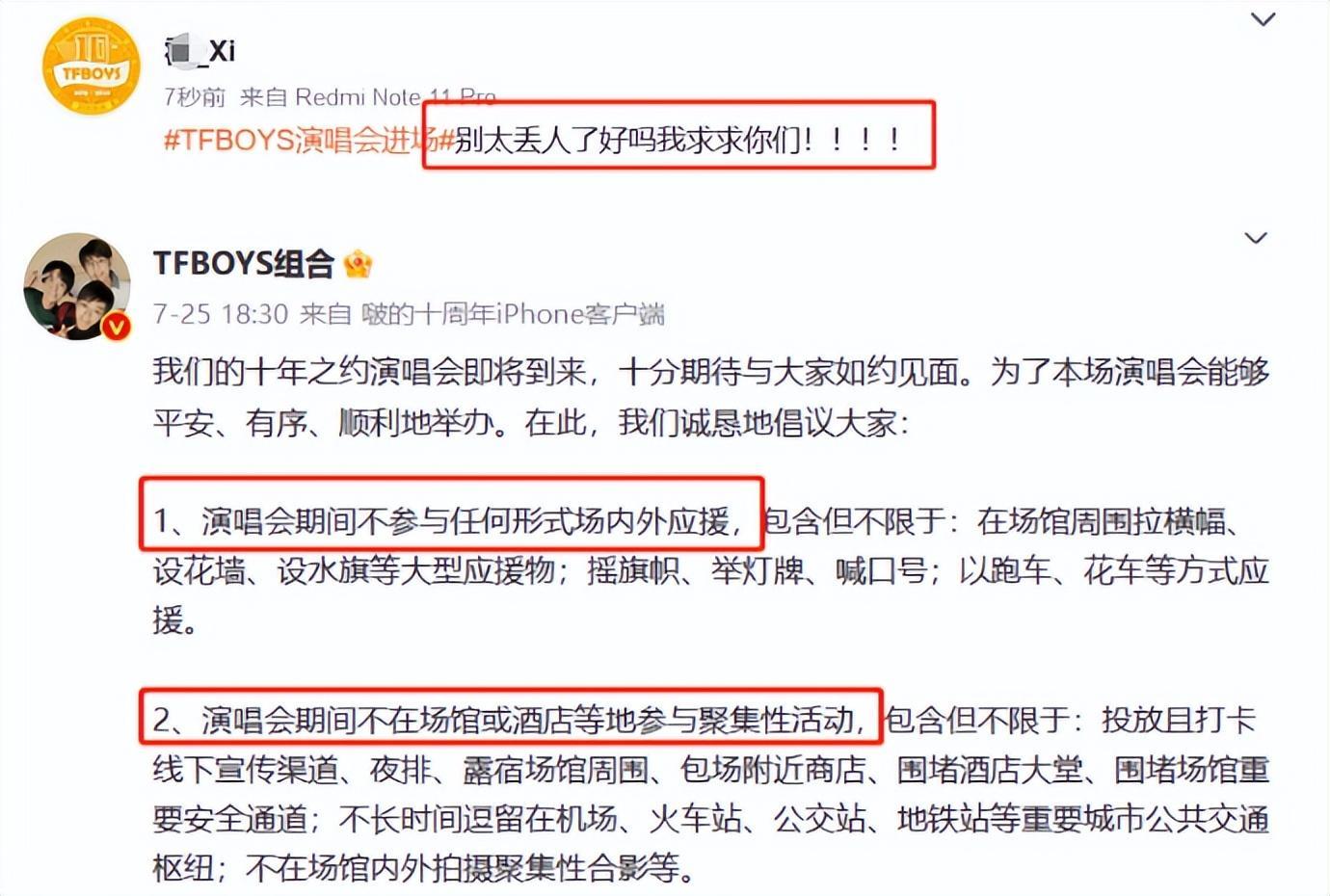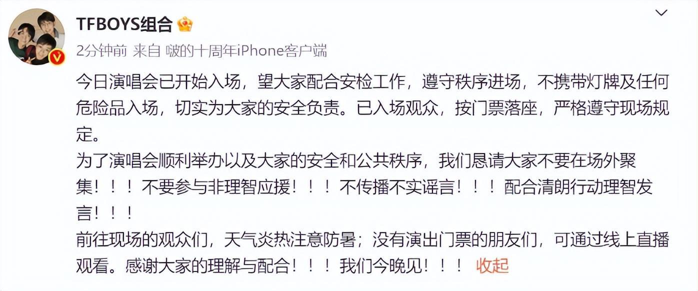 现场混乱成这样,正主自然得出来劝解粉丝,随即三小只也联合团队在社交平台上发布了联合告知动态,希望大家配合安检工作,不要非理智应援,也不要传播谣言,很显然,如果再任其发展,恐怕连活动就直接停止了。