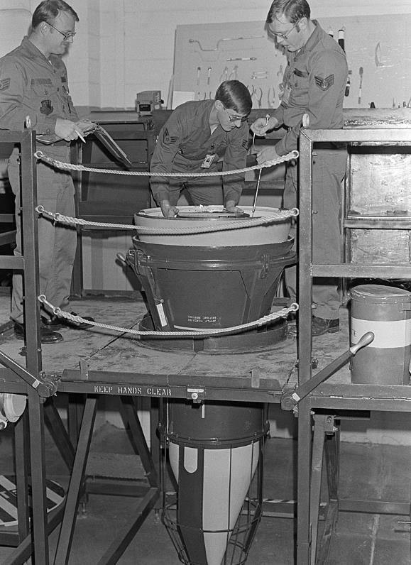 图为三名美国技术人员,正在“民兵Ⅱ”洲际导弹中的W-56/ MK-11型弹头周围工作