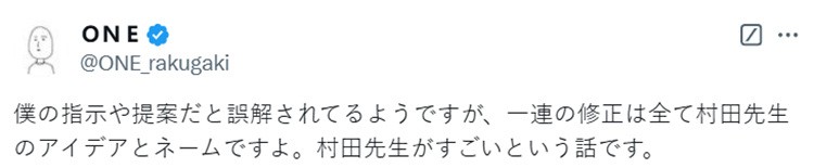 不过2016年已经过去了那么久,二人的关系有何变化也很难说清。对此又有人找出了ONE在2020年发表的推特,他当时提到有些人误以为重制版的每次修改都是遵从他的指示和建议,但实际上一连串的修改都是村田老师提供的创意和分镜,村田老师非常厉害。从这段推文可以看出ONE在漫画连载中已不再是主导地位,所以后续的剧情问题多半真的是村田的责任……