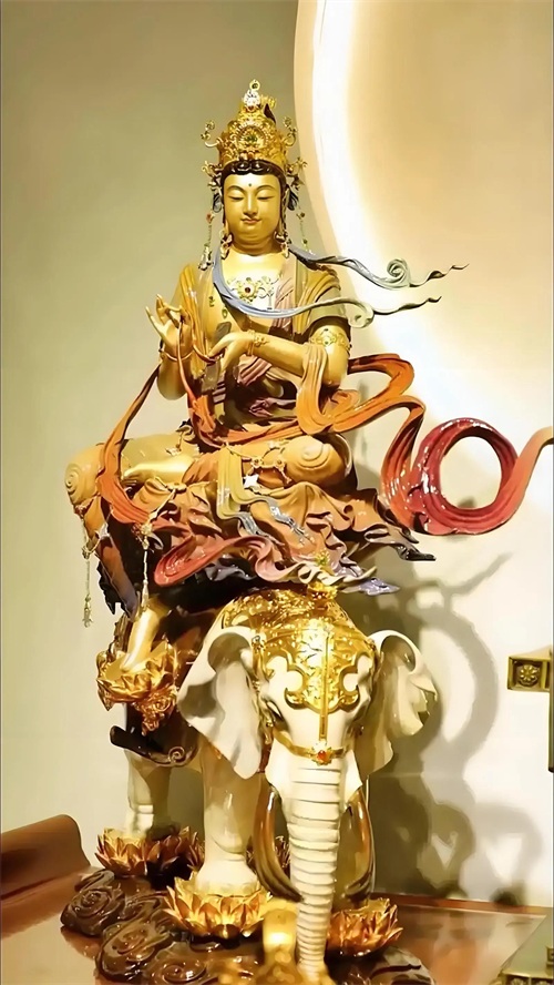 接着是普贤菩萨,头顶五佛宝冠,象征大勇。普贤菩萨身骑六牙白象,为华严三圣之一。与文殊菩萨相对应,俗称左智右礼。至于普贤菩萨所持法器为何,不同的形态和法相又对应着什么,在此暂不赘述。