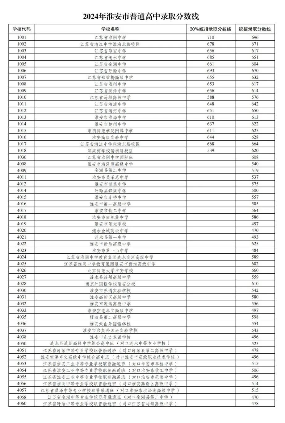 2024年江苏省淮安市普通高中录取分数线