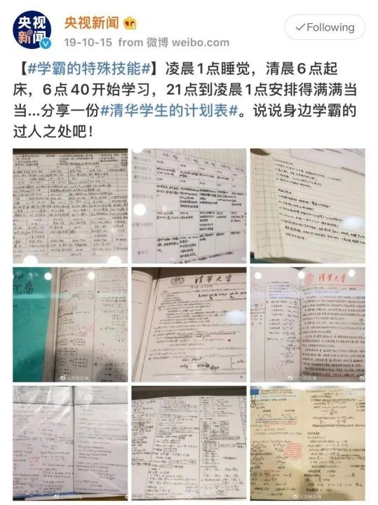央视新闻曾发了一份“清华学生的计划表”图,九宫格图片显示,清华学霸们凌晨1点休息,清晨6点起床,6点40分开始学习,晚9点到凌晨1点安排得满满当当。