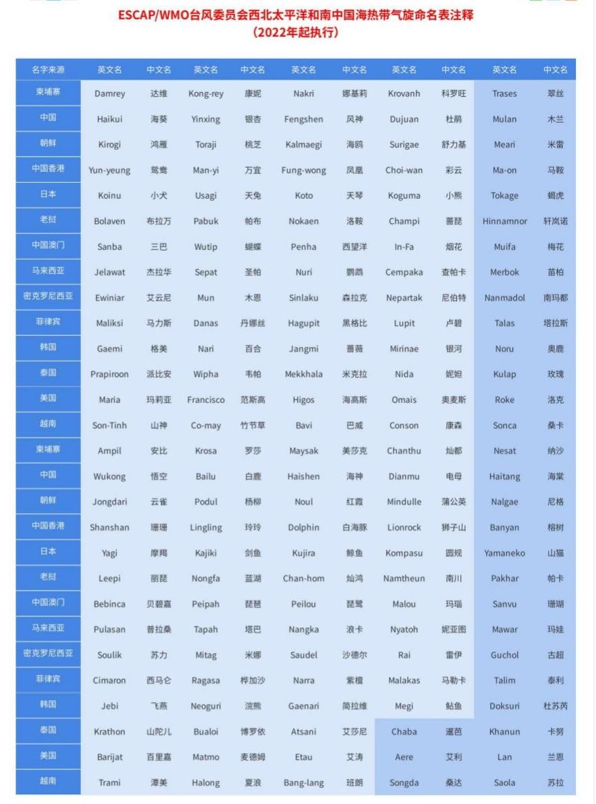ESCAP/WMO台风委员会西北太平洋和南中国海热带气旋命名表 图片源自中国气象局