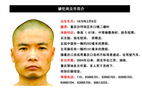 以上种种,均系周克华犯下的罪行,被害人中包括了无辜的路人,也包括警察和军人。而周克华也因此受到了国家的高度重视,在全国范围内对周克华进行搜捕。终于在2012年得到情报,周克华于重庆沙坪区出现。
